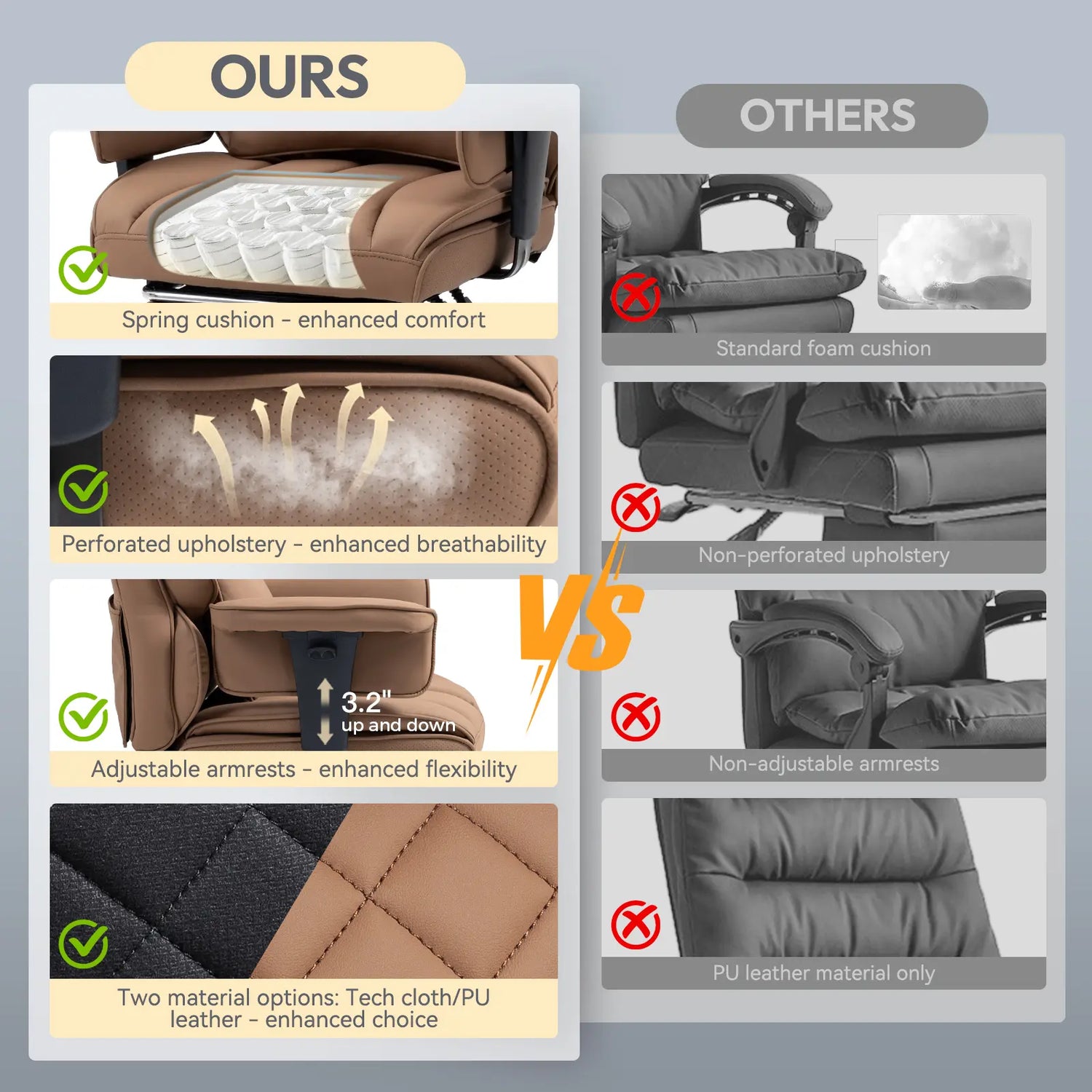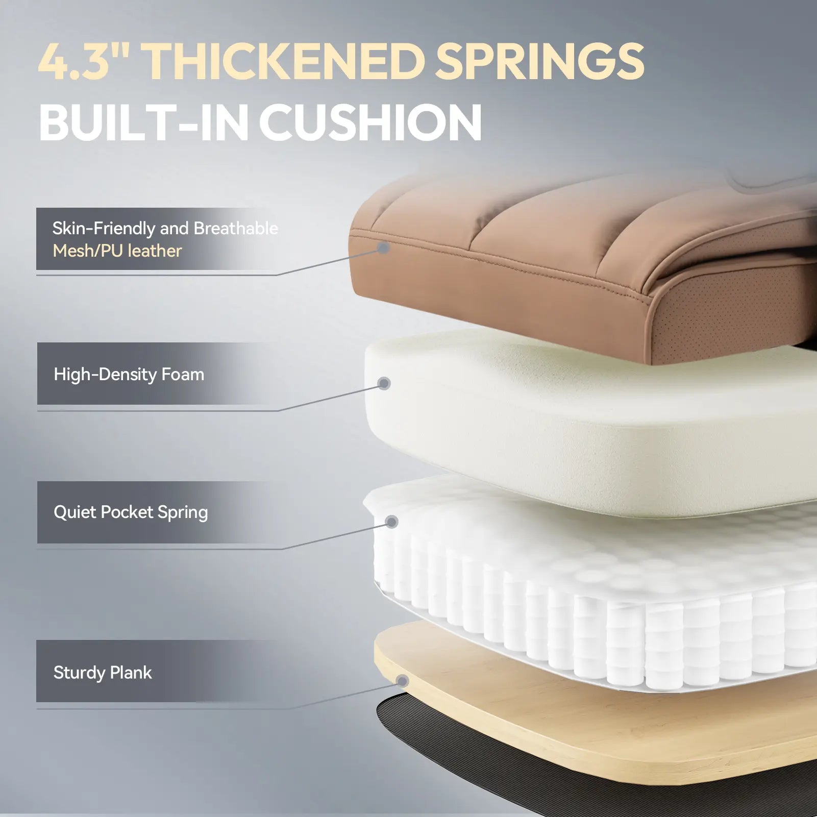 A: Most office chairs use high-density foam that flattens over time. Our Individual Pocket Springs act like a premium mattress—they contour to your body shape and bounce back instantly, providing consistent support for years without "bottoming out."